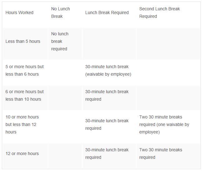 - A reminder to everyone regarding lunch breaks. They are mandatory after the 6th hour of work but anything below that and it’s at your discretion. See the chart below for a wider reference of lunches for longer days. This was copied from a California Labor Laws information website.