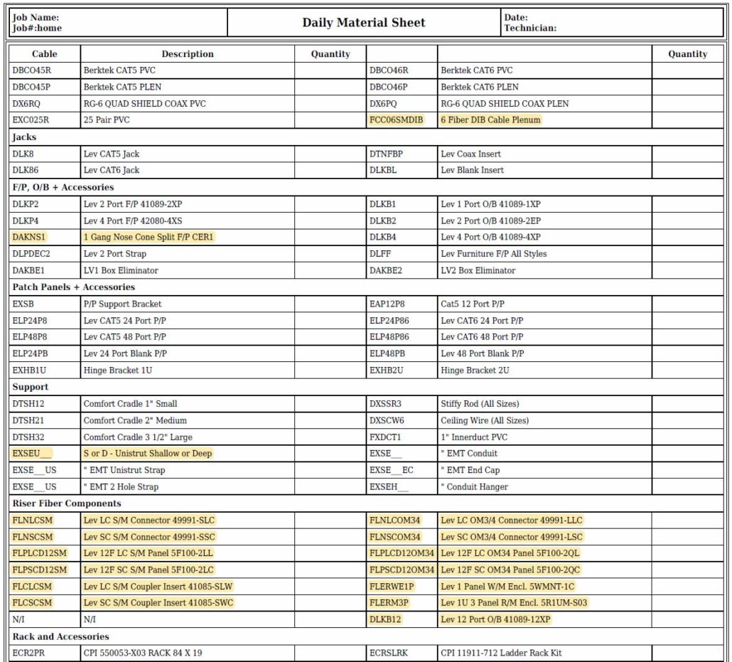 - A new “Daily Material Sheet” form is active. Low/Unused items were removed and higher use/newer items have been added. The biggest additions are in the “Riser Fiber Components”, but there are a couple of others as well. This should drop the number of hand written items on future sheets. See picture below for highlighted items.