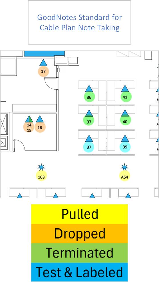 - Below is the color code system we will standardize on for all as-builts when highlighting outlet locations/numbers to know it’s status.